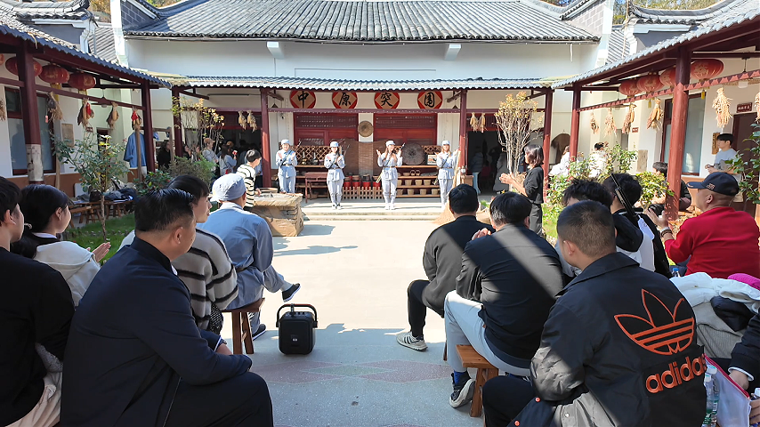 彩排现场,演员们在河西村村口再现转移前的动员场景,演绎新四军与村民的对话。每一段表演结束,大家便围聚在指导老师身边,结合实地场景调整细节:有人根据院落空间调整肢体动作幅度,有人依据户外声场变化优化台词、提高音量,力求让表演与河西村的历史氛围深度契合,精准传递角色情感。