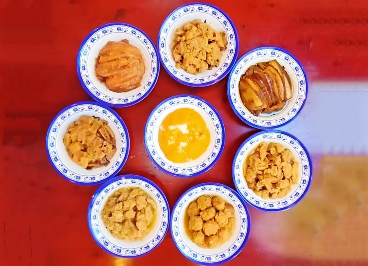 襄阳八大碗蒸菜制作技艺是以“三蒸九扣”为特色的地方蒸菜制作技艺,历经百年传承,现以“望楚山·襄阳八大碗”酒店为代表。襄阳八大碗采用本土食材,融合楚菜蒸技,形成荤素搭配、咸甜兼具的八碗体系。核心工艺含“酥、炸、倒、扣”四序,如酥土鸡需炸后蒸制1小时,既保原味又增软糯,宴席必用八仙桌配八人席。该技艺覆盖襄阳全境,兼具历史传承与健康理念,成为展现地域文化的鲜活符号。