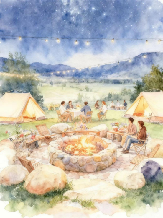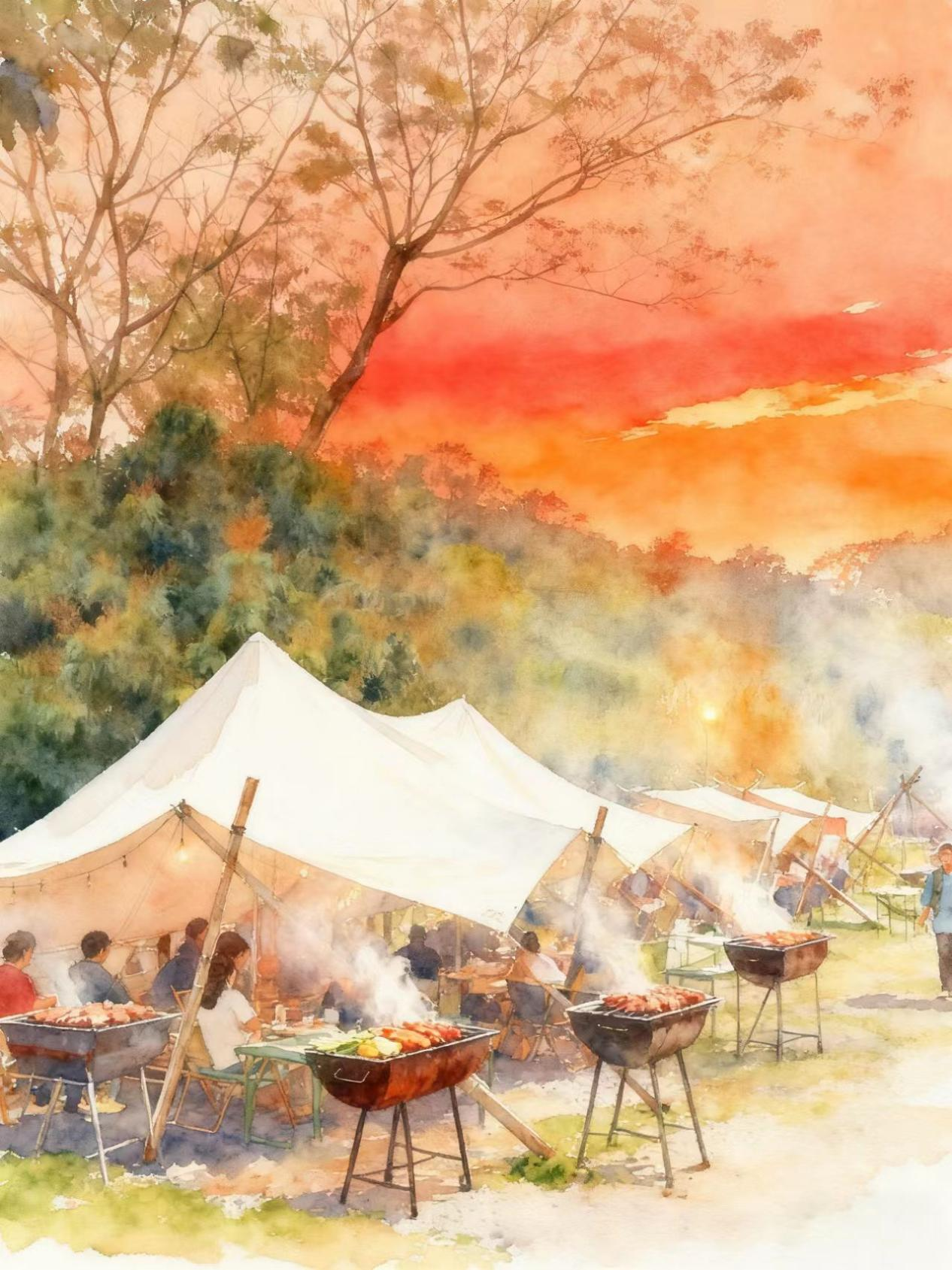 此景可作《星野宴游图》。构图开阔,以浓墨泼写夜幕山影,留白为星河,营帐点缀其间。中心以朱砂、胭脂轻染篝火与烧烤炊烟,人物姿态生动欢愉。画面动静结合,墨色与暖色交融,尽显“幕天席地,纵情欢歌”的旷达野趣。