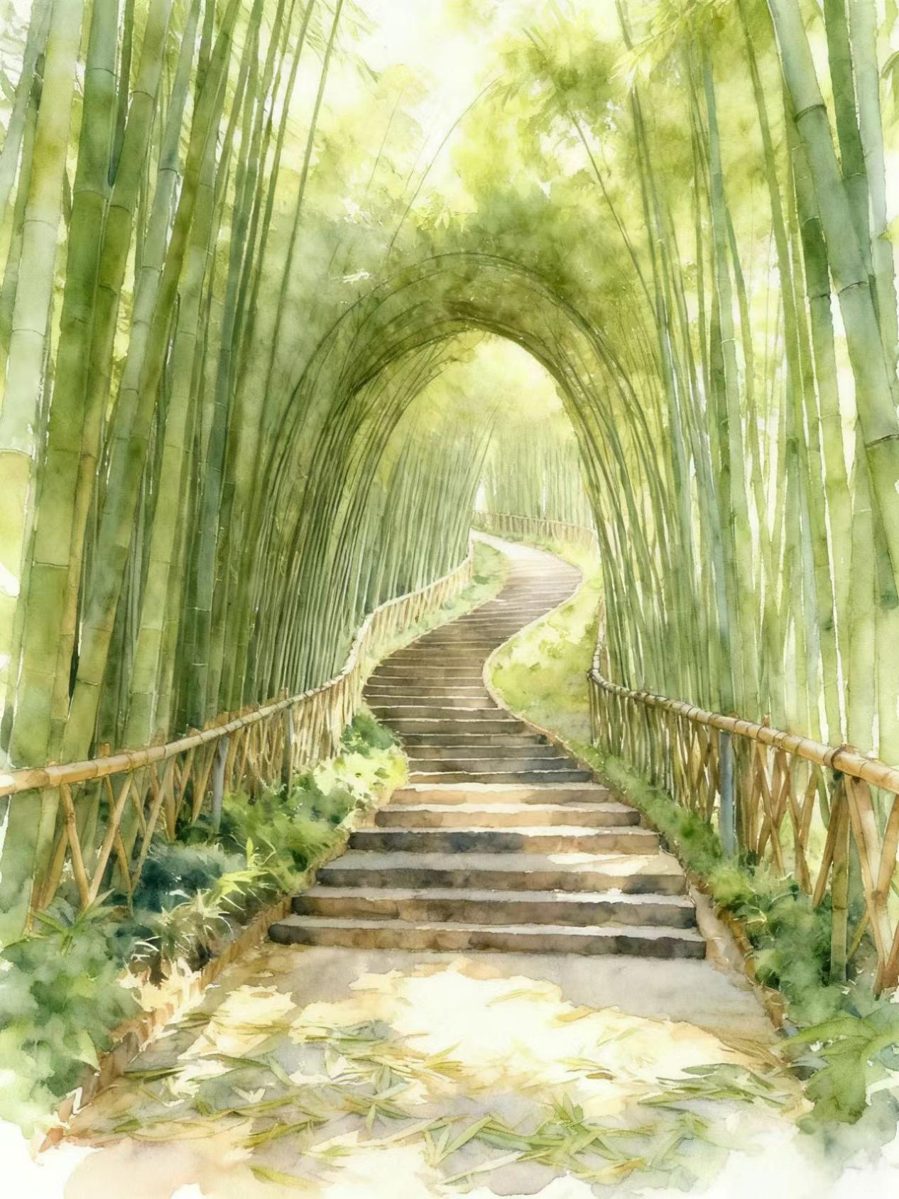 此景正宜《竹径通幽图》。全幅以墨竹为主,运用深浅不同的墨色,表现雷竹的远近、老嫩与风姿。小径蜿蜒引向深处,或有雅士背影,似在寻幽探微。画面清气袭人,竹叶飒飒如有声,充分体现“墨分五彩,竹蕴千姿”的艺术之境与灵感源泉。