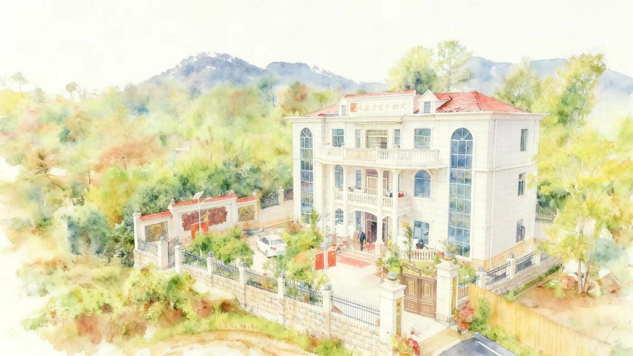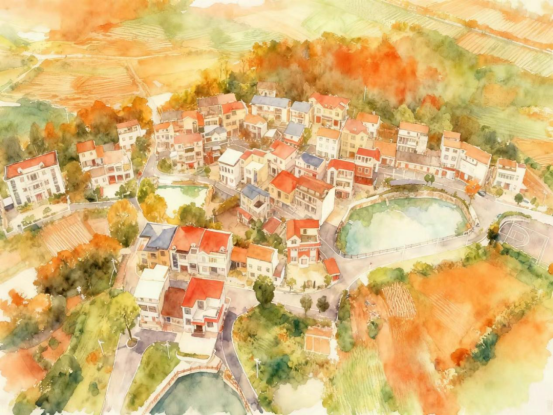 俯瞰视角,青瓦白墙的民宿集群依山傍水而筑,以湿润的墨韵渲染,间以暖黄点染窗棂灯火,似渔火点点。近处小桥流水,远处淡山如黛,整体氤氲着水墨交融的朦胧感,一幅“万家灯火炊烟起,此心安处是吾乡”的温润山居长卷。