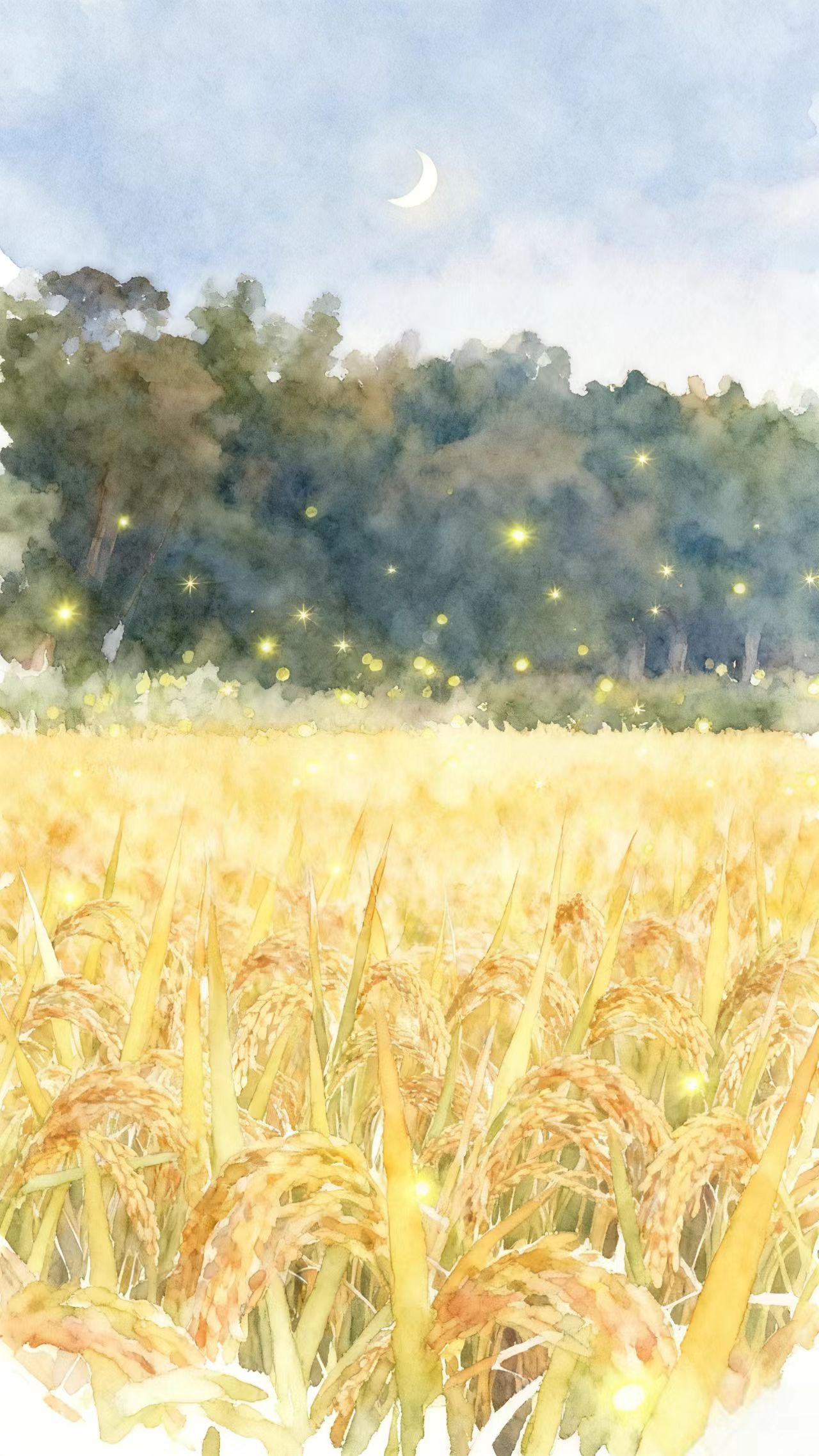 《暗夜流萤图》。此乃全卷最“计白当黑”之景。大幅面以极淡墨渲染夜幕与稻浪轮廓,仅以极细工笔辅以淡淡金粉,疏疏点出飞舞萤火。画面静谧深邃,观之需屏息凝神,方能在“无声之处听惊雷,暗夜之中见流光”。