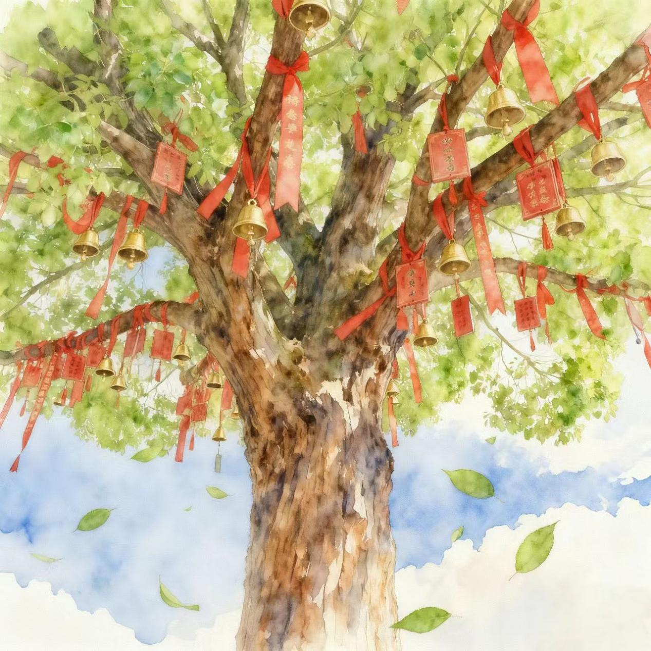 《古木祈愿图》,以苍劲老辣的笔法勾勒参天古树,枝叶如云。朱砂点缀其间的祈福丝带,宛若古树开出的红花,象征愿力生生不息。