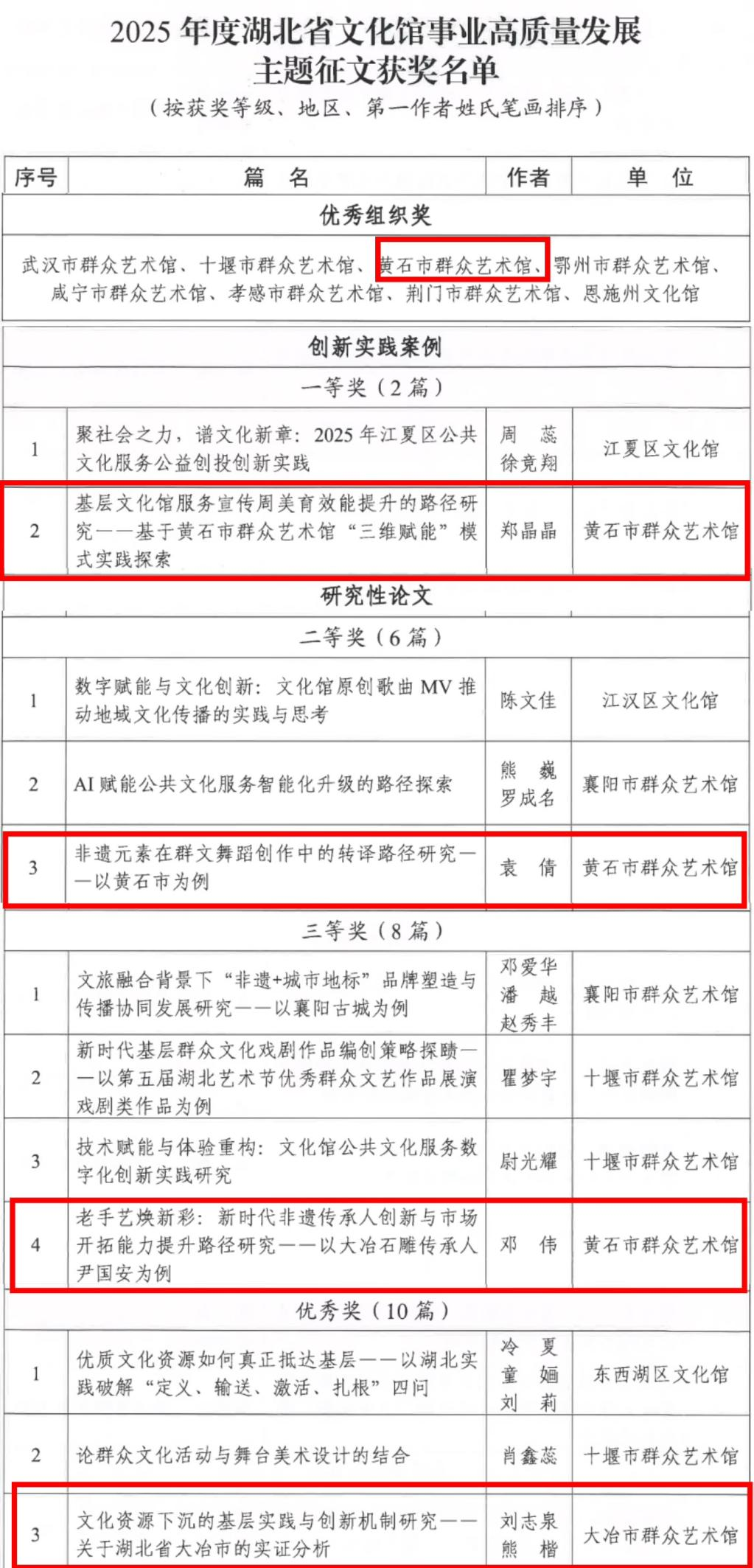 由湖北省群众艺术馆(湖北省非物质文化遗产保护中心)主办的2025年度湖北省文化馆事业高质量发展主题征文活动,自今年3月征稿通知发布以来,受到全省群文系统的广泛关注。通过全省各市州文化(群艺)馆的组织推荐,本次活动共征集研究性论文42篇,创新实践案例20篇。经过专业机构检测查重、专家初审和复评,最终确定了获奖名单,于12月11日完成公示。