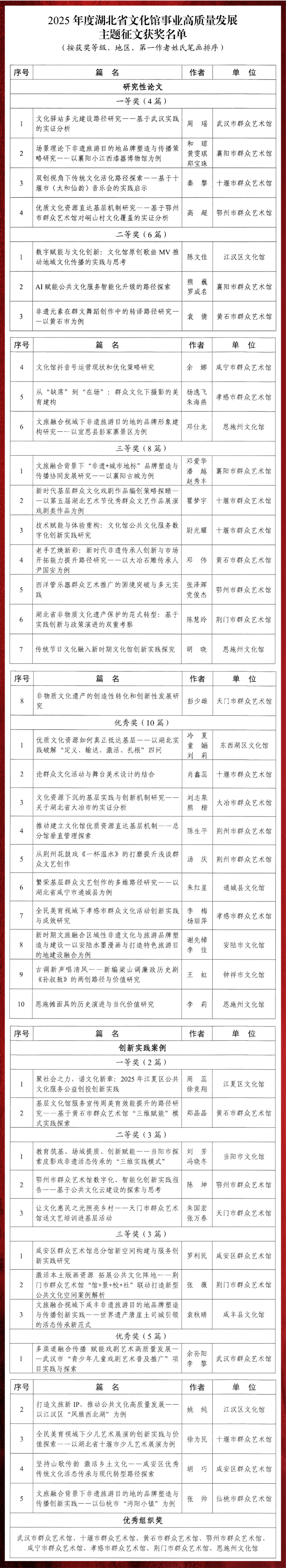 通过全省各市州文化(群艺)馆的组织推荐,本次活动共征集研究性论文42篇,创新实践案例20篇。经过专业机构检测查重、专家初审和复评,最终确定了获奖名单。