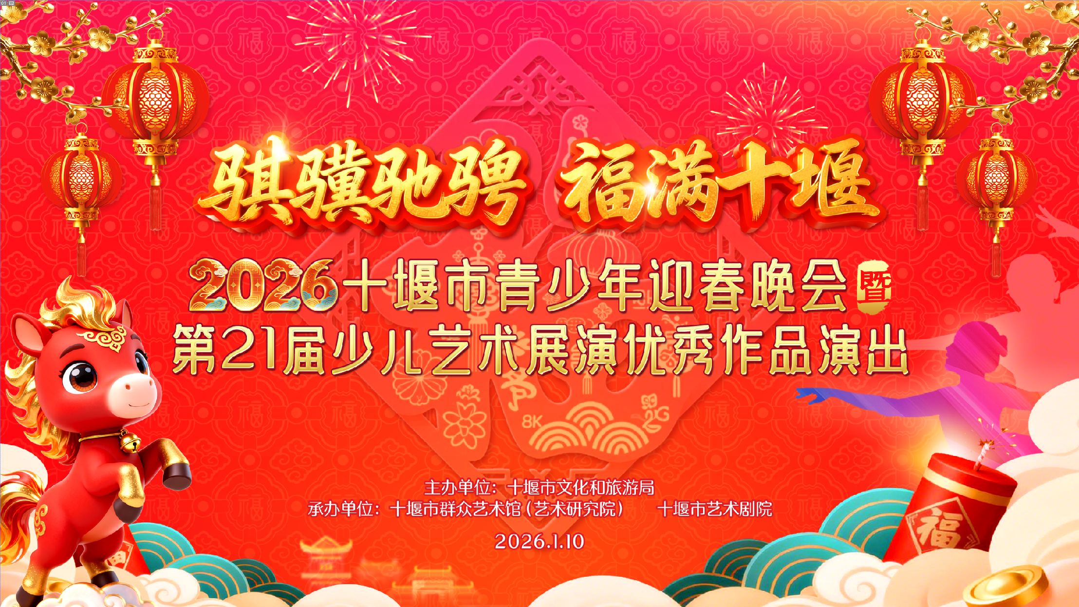 为大力弘扬社会主义核心价值观,传承中华优秀传统文化,不断丰富我市青少年精神文化生活,由十堰市文化和旅游局主办,十堰市群众艺术馆(艺术研究院)、十堰市艺术剧院承办的“2026年十堰市青少年迎春晚会暨十堰市第21届少儿艺术展演优秀作品演出”将于1月10日下午15点在十堰市艺术剧院剧场举行,敬请广大市民朋友莅临观看。