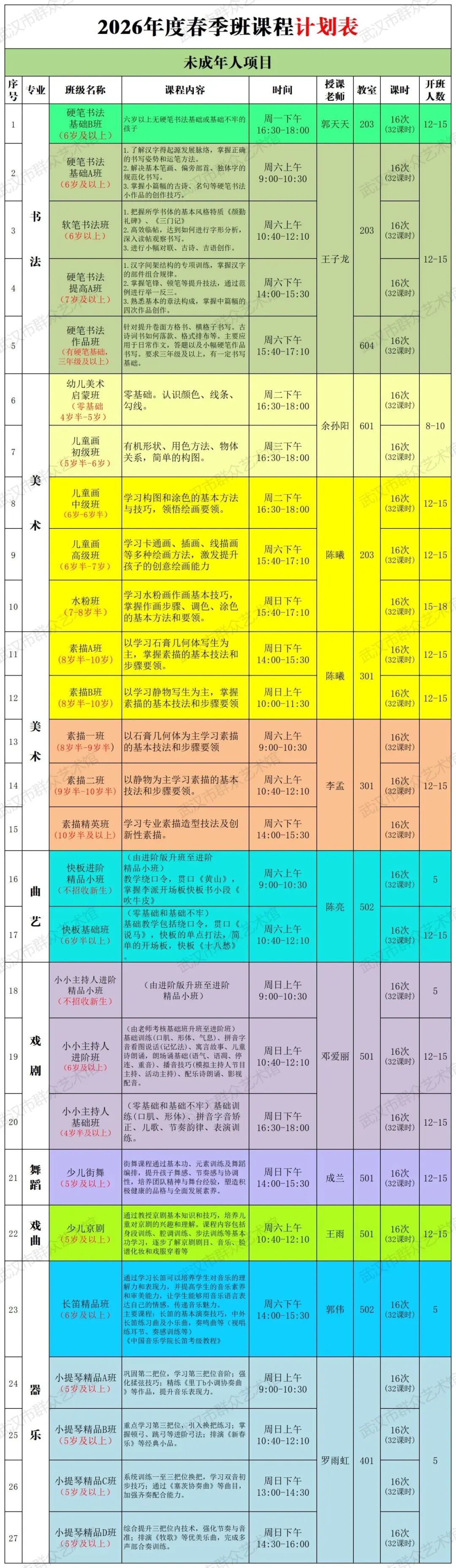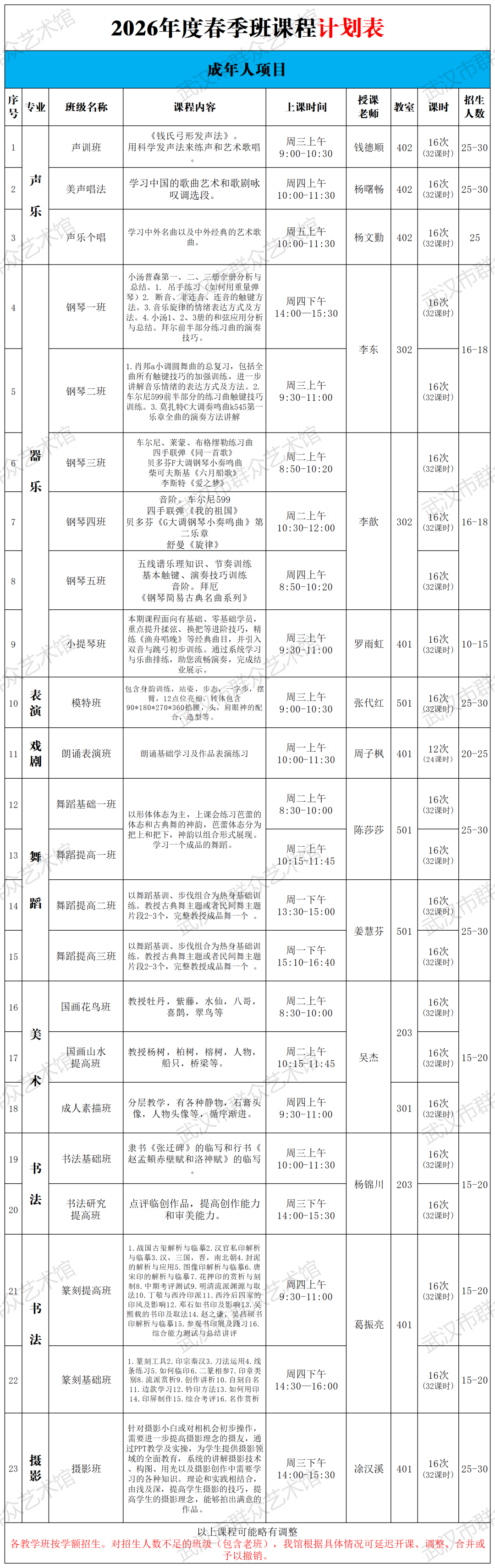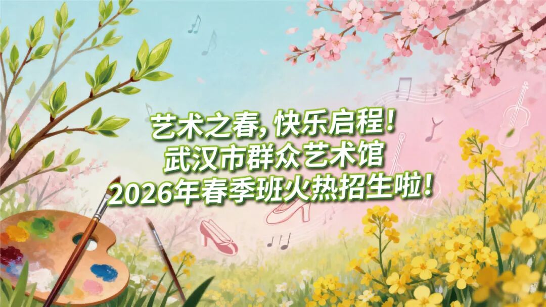 为丰富市民精神文化生活、提升大众审美素养与艺术技能,同时为充分发挥我馆“全国青少年美育示范基地”引领作用,武汉市群众艺术馆2026年春季班开始招生啦!我们为全年龄段艺术爱好者量身定制了多元课程,音乐、舞蹈、书法、美术、摄影、戏曲……超多有趣内容等你来pick。欢迎广大市民踊跃咨询、报名参与。