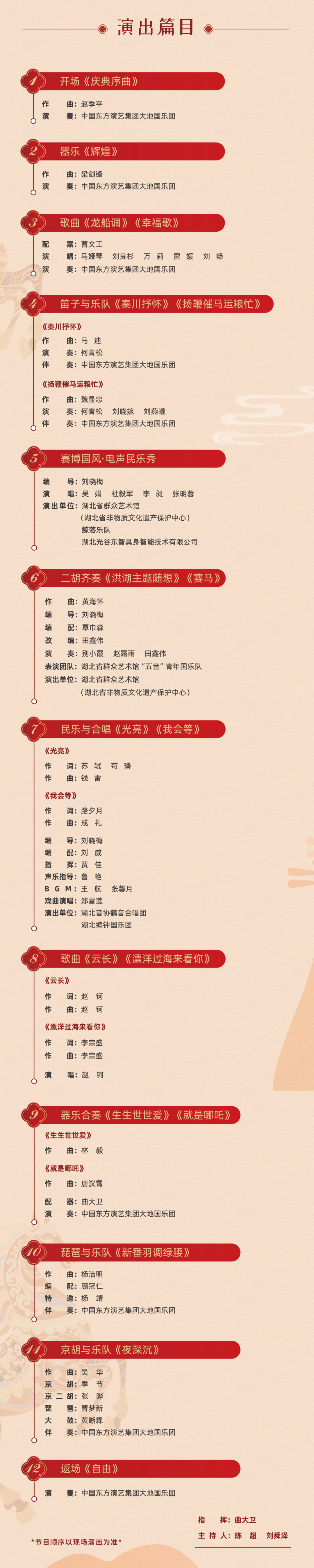 这将是一场科技与艺术深度交织的视听盛宴,东方演艺集团大地国乐团以著名音乐家赵季平的经典作品《庆典序曲》盛大开场。随后,传统器乐与流行金曲展开多元演绎,既有《秦川抒怀》《扬鞭催马运粮忙》的笛韵悠扬,《洪湖主题随想》《赛马》的二胡齐鸣,亦有《光亮》《我会等》的民乐合唱,《漂洋过海来看你》《就是哪吒》的跨界新编。
