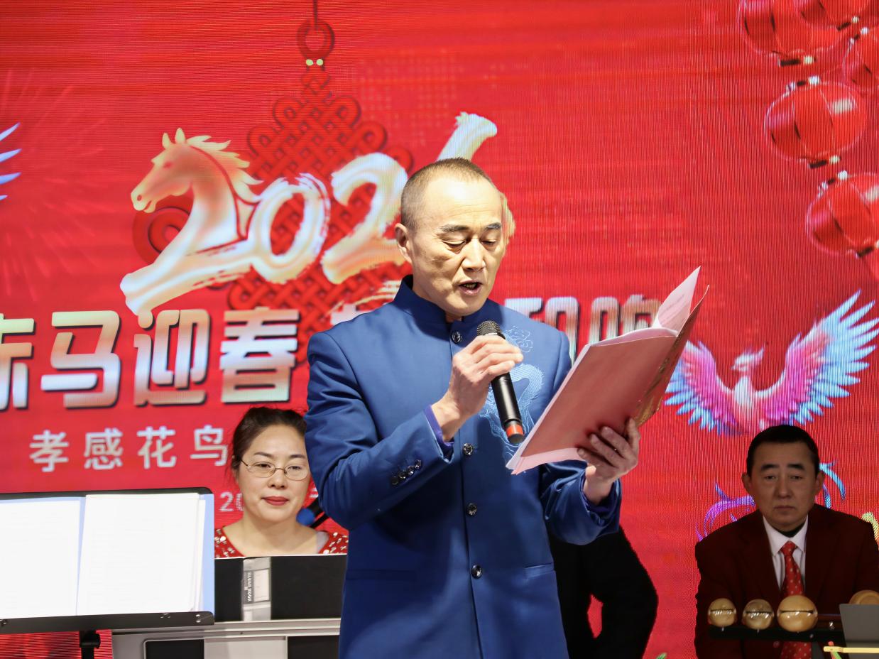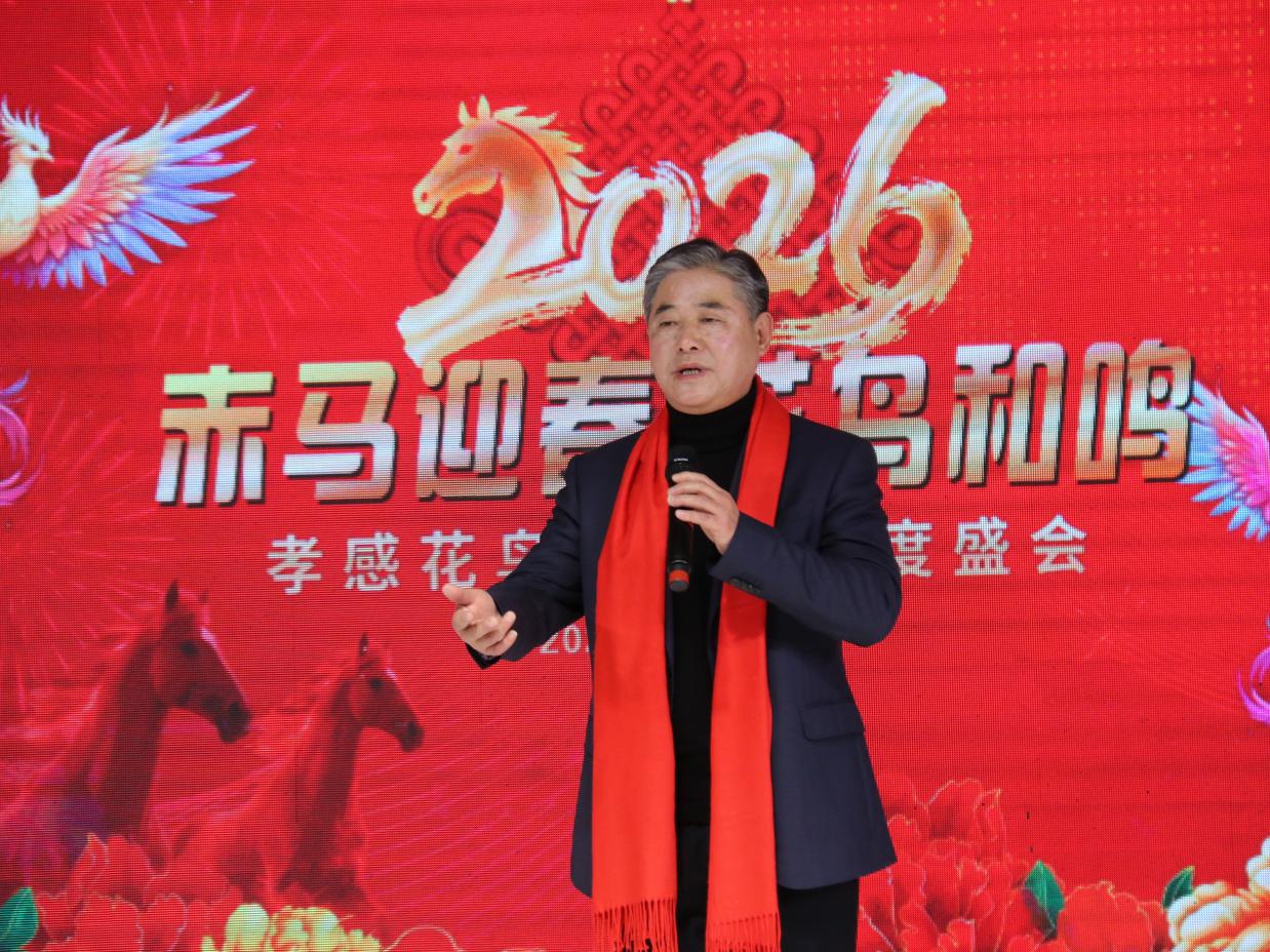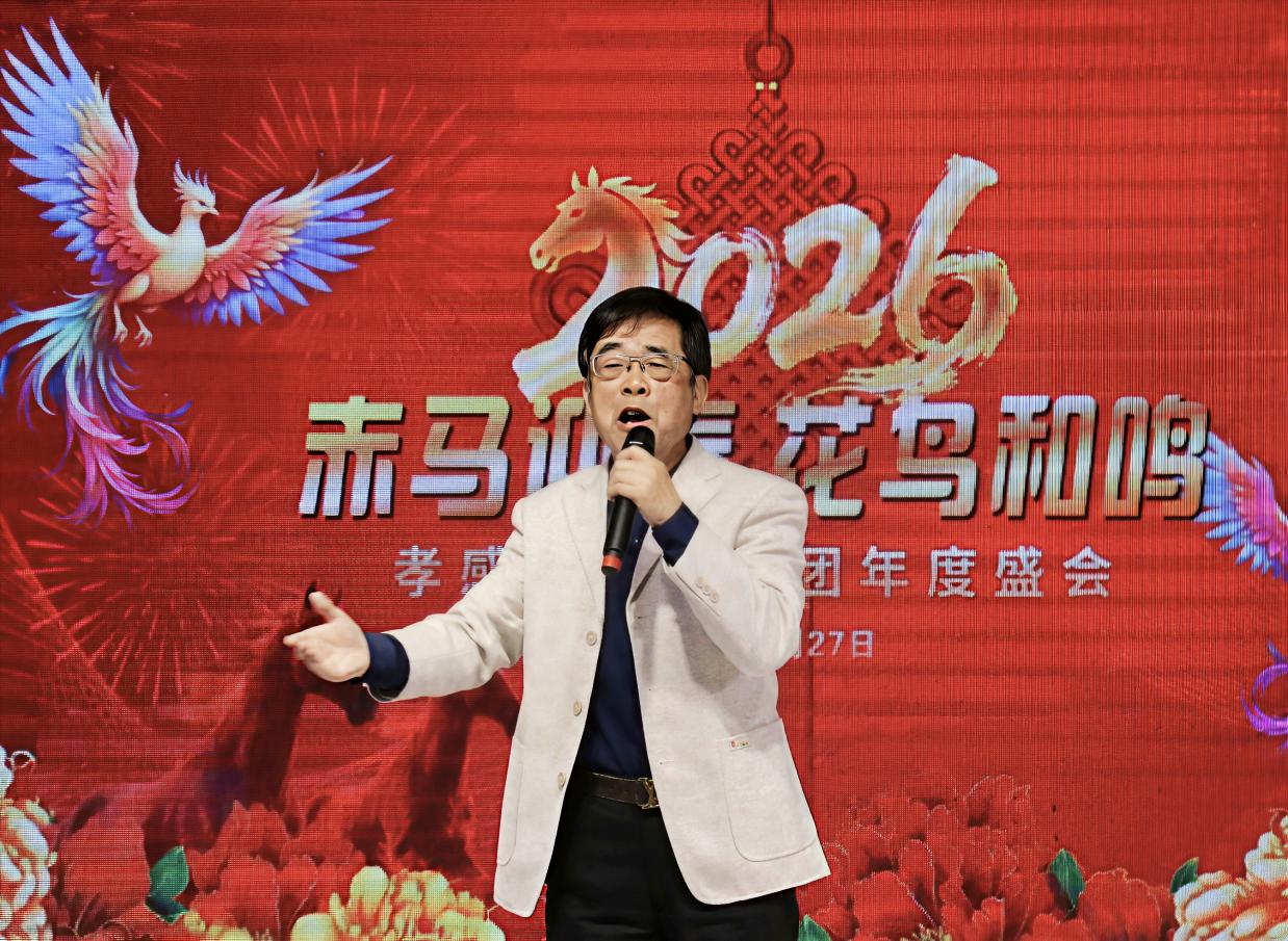 孝感花鸟艺术团梅志勇团长登台致辞,全面回顾了艺术团2025年的发展历程与丰硕成果。梅团长表示,艺术团成立两年来,在党支部领导与团委会组织下,已成长为涵盖器乐、声乐、舞蹈、模特走秀、小品、湖北大鼓等多元形式的综合表演团队,始终秉持“业余团队、专业水平”的发展理念,通过调整领导班子、设立艺委会,构建了高效有序的管理体系。在精品创作方面,艺术团深挖经典作品,创新表演形式,打造了《山歌好比春江水》等特色节目;积极孵化原创力作,情景小品《槐荫船说》历经反复打磨,在社区演出中广受好评;聚焦非遗传承,胡云来同志自创的湖北大鼓《特殊彩礼》《正气歌》《孝文化美名扬》成为团内标志性节目。同时,艺术团注重人才融合与交流,吸引德艺兼备的艺术人才加入,借助兄弟团队助力,打造了模特走秀《搀扶》等爆款节目,彰显了开放包容的发展格局。 2025年,孝感花鸟艺术团深耕实践、积极奉献,全年完成10场重要演出,足迹遍布城乡社区,为广大市民带来100余个精彩节目:参与孝感市委宣传部、市文化和旅游局、市群众艺术馆组织的“红色文艺轻骑兵进社区”活动,走进三里棚社区、春云社区;亮相“城市文明美在社区”主题演出,在各街道社区开展惠民表演;民乐合奏《步步高》《地道战》、京剧《家住安源》、楚剧《李双双》、歌伴舞《大江南》《一起向美好》等经典节目广受赞誉,相关演出被媒体报道,收获社会各界广泛关注。2026年,艺术团将持续精进,完善制度建设、聚焦精准创作、丰富演出形式,加强艺术交流,为群众文化生活注入更多活力。