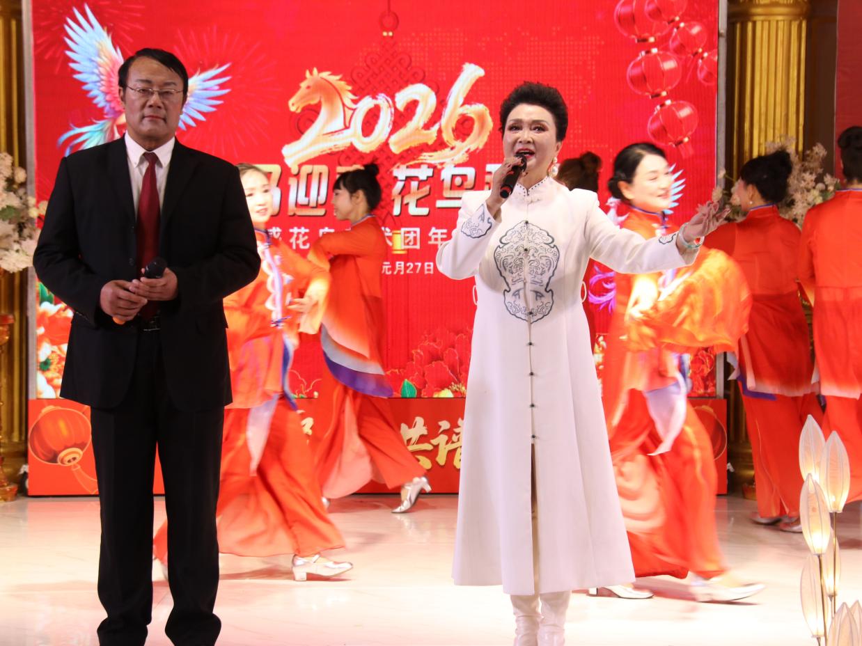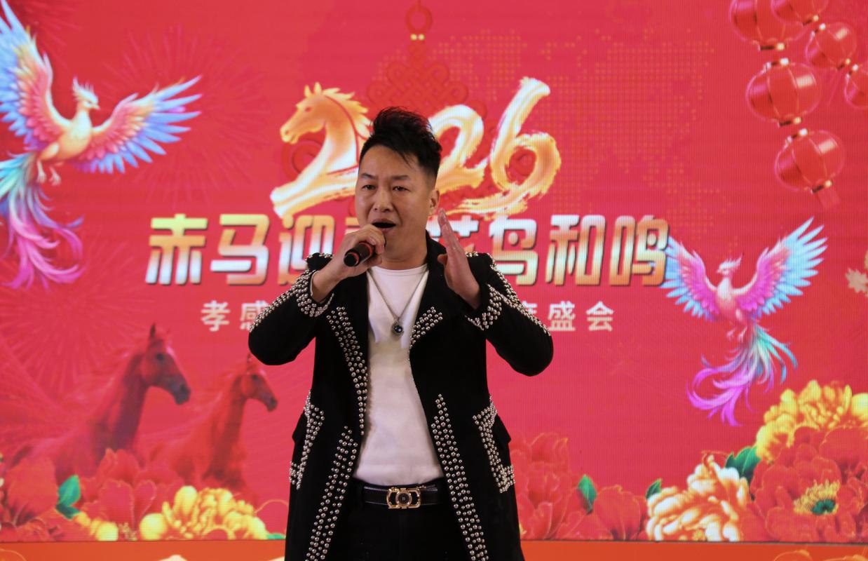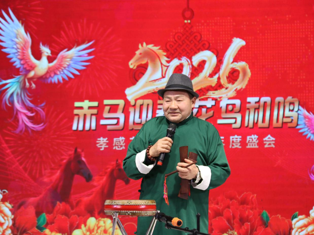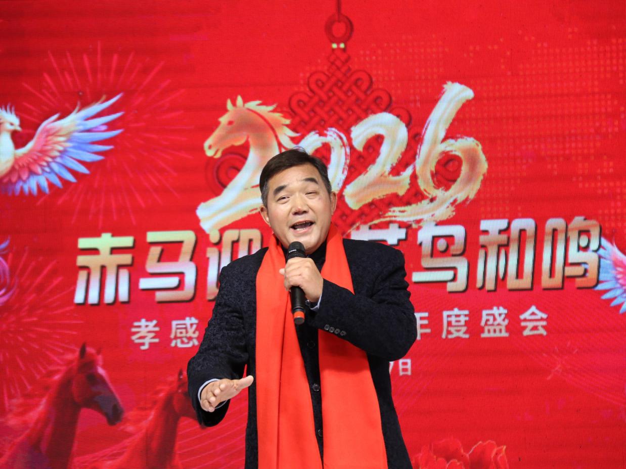 孝感花鸟艺术团梅志勇团长登台致辞,全面回顾了艺术团2025年的发展历程与丰硕成果。梅团长表示,艺术团成立两年来,在党支部领导与团委会组织下,已成长为涵盖器乐、声乐、舞蹈、模特走秀、小品、湖北大鼓等多元形式的综合表演团队,始终秉持“业余团队、专业水平”的发展理念,通过调整领导班子、设立艺委会,构建了高效有序的管理体系。在精品创作方面,艺术团深挖经典作品,创新表演形式,打造了《山歌好比春江水》等特色节目;积极孵化原创力作,情景小品《槐荫船说》历经反复打磨,在社区演出中广受好评;聚焦非遗传承,胡云来同志自创的湖北大鼓《特殊彩礼》《正气歌》《孝文化美名扬》成为团内标志性节目。同时,艺术团注重人才融合与交流,吸引德艺兼备的艺术人才加入,借助兄弟团队助力,打造了模特走秀《搀扶》等爆款节目,彰显了开放包容的发展格局。 2025年,孝感花鸟艺术团深耕实践、积极奉献,全年完成10场重要演出,足迹遍布城乡社区,为广大市民带来100余个精彩节目:参与孝感市委宣传部、市文化和旅游局、市群众艺术馆组织的“红色文艺轻骑兵进社区”活动,走进三里棚社区、春云社区;亮相“城市文明美在社区”主题演出,在各街道社区开展惠民表演;民乐合奏《步步高》《地道战》、京剧《家住安源》、楚剧《李双双》、歌伴舞《大江南》《一起向美好》等经典节目广受赞誉,相关演出被媒体报道,收获社会各界广泛关注。2026年,艺术团将持续精进,完善制度建设、聚焦精准创作、丰富演出形式,加强艺术交流,为群众文化生活注入更多活力。