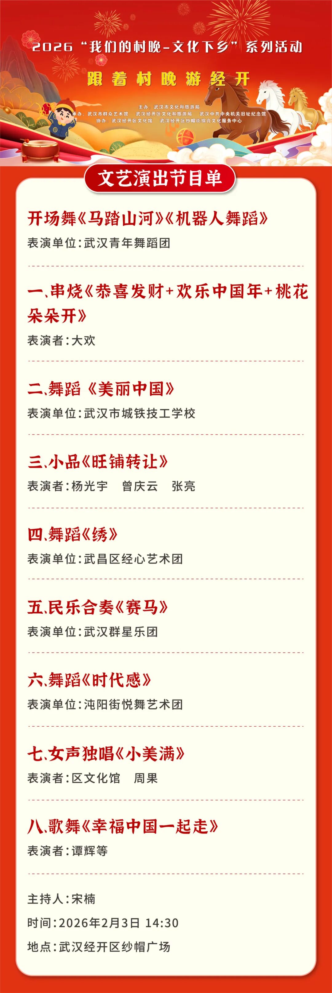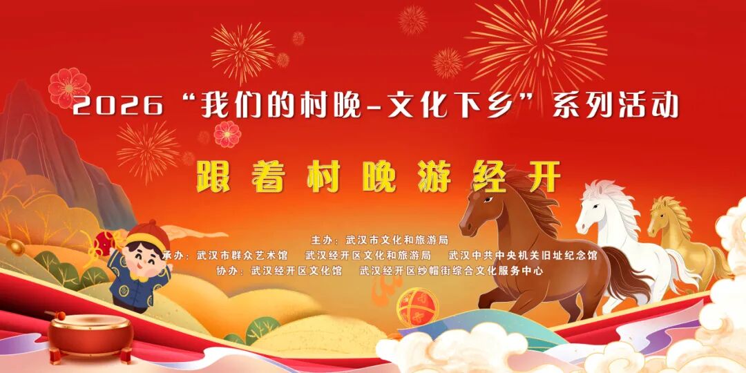 欢歌庆丰岁,骏马踏春归。2026马年新春佳节即将到来之际,为深入贯彻习近平新时代中国特色社会主义思想,宣传党的二十届四中全会精神,推动优质文化资源直达基层,丰富基层群众文化生活,营造欢乐、文明、祥和的节日氛围,2月3日,由武汉市文化和旅游局主办,武汉市群众艺术馆、武汉市经开区文化和旅游局、武汉中共中央机关旧址纪念馆承办,武汉市经开区文化馆、武汉市经开区纱帽街综合文化服务中心协办的2026“我们的村晚——文化下乡”系列活动之“跟着村晚游经开”专场,即将走进武汉经开区纱帽广场。届时将呈现文艺汇演、书法名家现场书写赠送春联与福字等丰富文化活动,为广大市民和乡亲带来一场充满乡土气息与文化韵味的迎春盛宴。