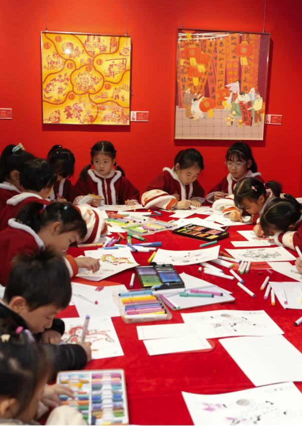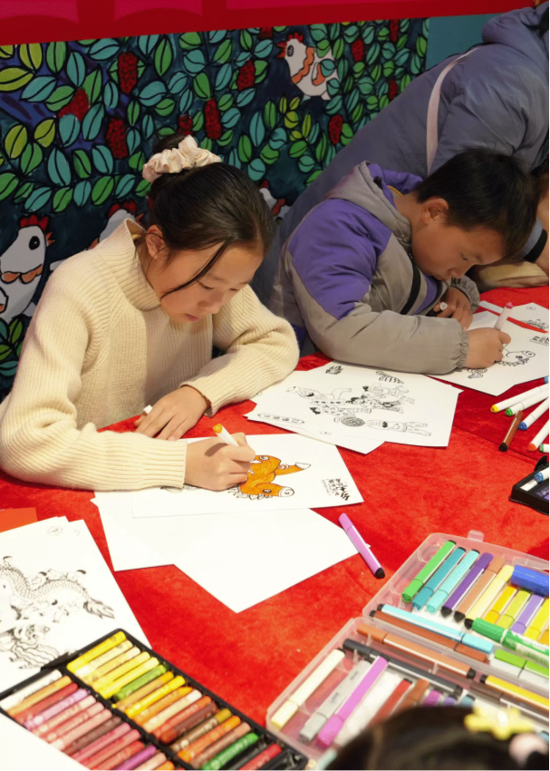 紧接着,趣味十足的公教体验活动拉开帷幕。在农民画涂色体验区,孩子们挑选着自己喜爱的颜色,专注地为年画填色。饱满的红、热烈的黄、沉稳的蓝,他们沉浸在色彩的世界里,专心创作属于自己的新年画。画好了,孩子们满意地欣赏着画作。“我要带回家给妈妈看!”说罢,自信一挥,签下大名。