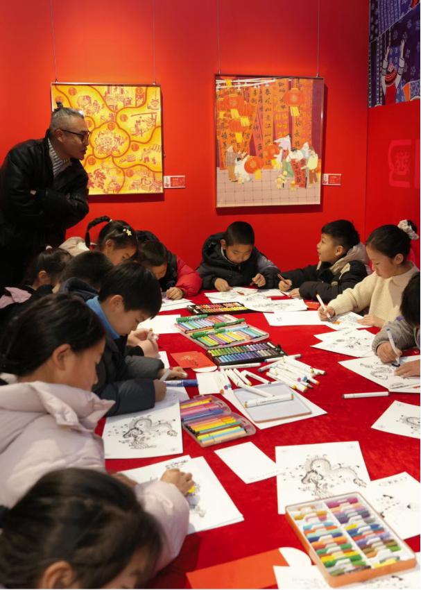 2月3日,省群艺馆美术展厅内暖意融融,一场以“彩绘荆楚中国年”为主题的湖北农民画迎新春画展公共教育活动在此温馨启幕。20多位来自涂家岭社区的大小朋友开启了一场年味十足的荆楚文化艺术之旅。