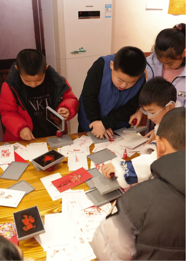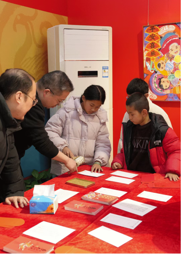 在拓印体验区,孩子们排着队,全神贯注地观察老师的操作示范,生怕错过任何一个细节。终于轮到自己了!他们手握滚筒蘸满金墨,模仿着老师的动作,小心翼翼地印下马年福字。“有点歪……”一位小男孩歪着头,似乎对自己的作品不太满意。“没事,再来一次。”在大家的鼓励下,他屏气凝神,再次蘸墨、对准位置、一气呵成——这一次,金马跃然纸上,神采飞扬。他咧嘴一笑,小心翼翼地捏住明信片一角,乐呵呵地向家长展示自己的得意之作。