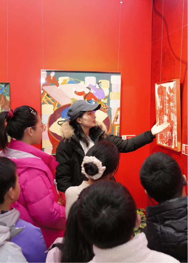 展厅里,省群艺馆工作人员的讲解,点燃了孩子们观察画面细节的兴趣——