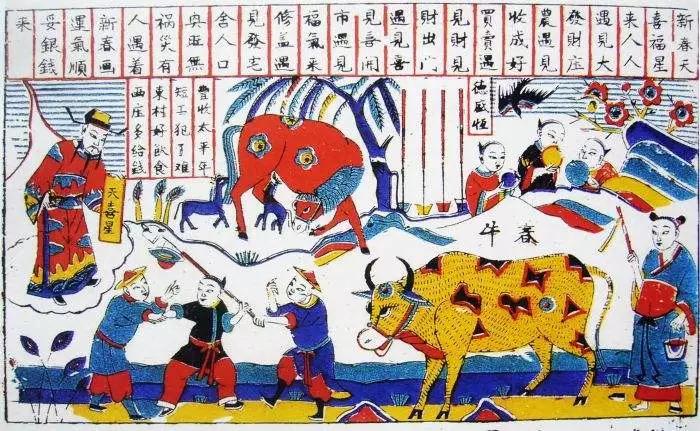 年画画面线条单纯、色彩鲜明、气氛热烈愉快,蕴涵各地独特的艺术风格。如春牛图、岁朝图、嘉穗图、戏婴图、合家欢、看花灯,胖娃娃等,并有以神仙、历史故事、戏剧人物作题材的。颇多作为门画张贴之用,夹杂着“神祇护宅”的观念,如“神荼郁垒”、“天官”、“秦琼敬德”等。