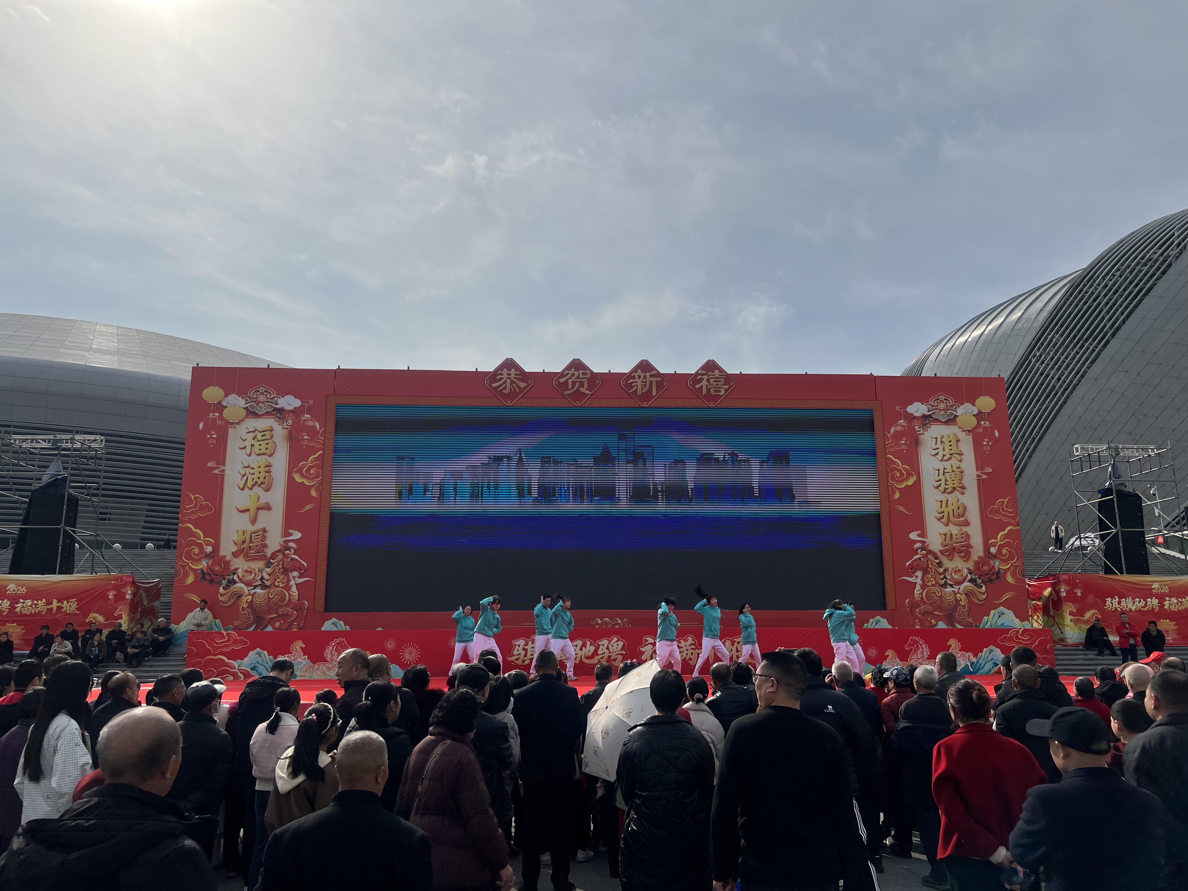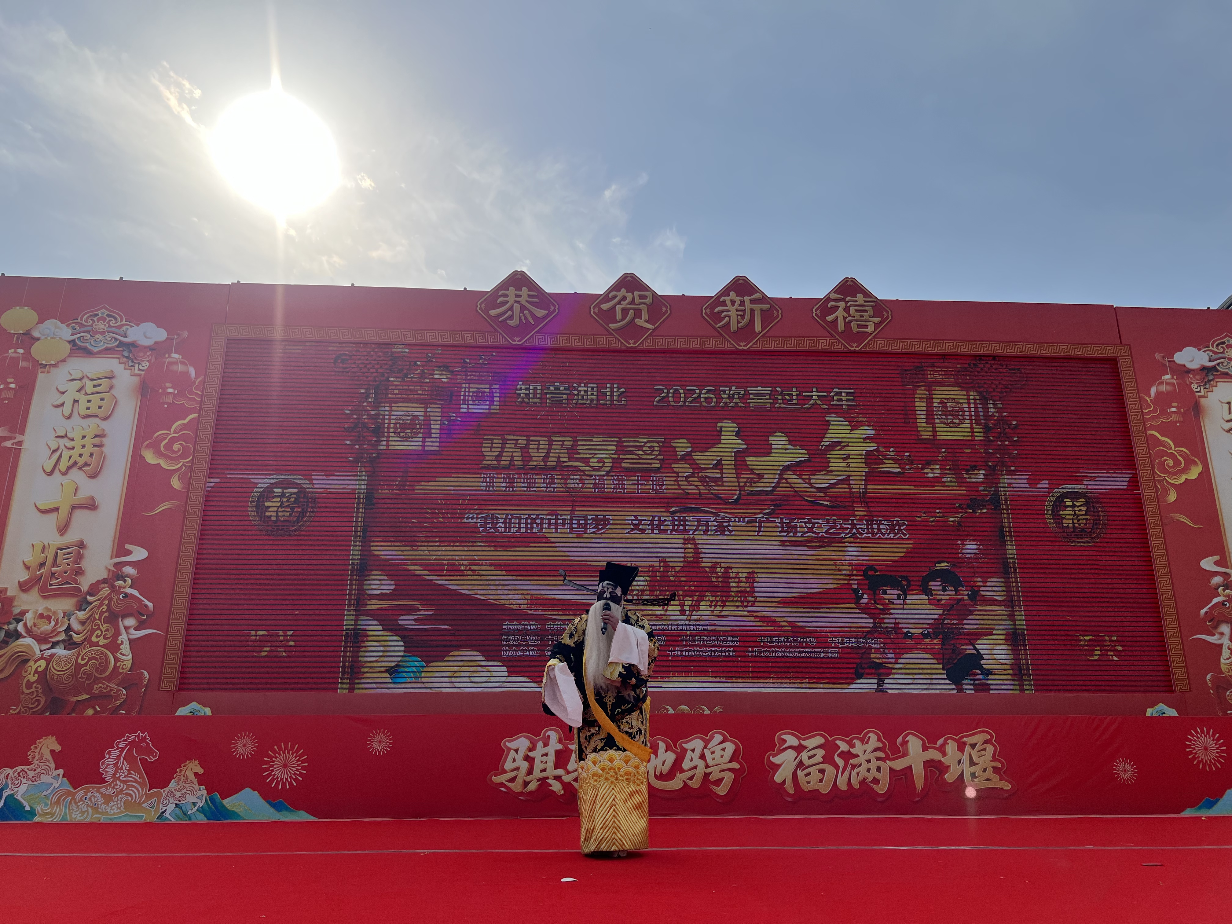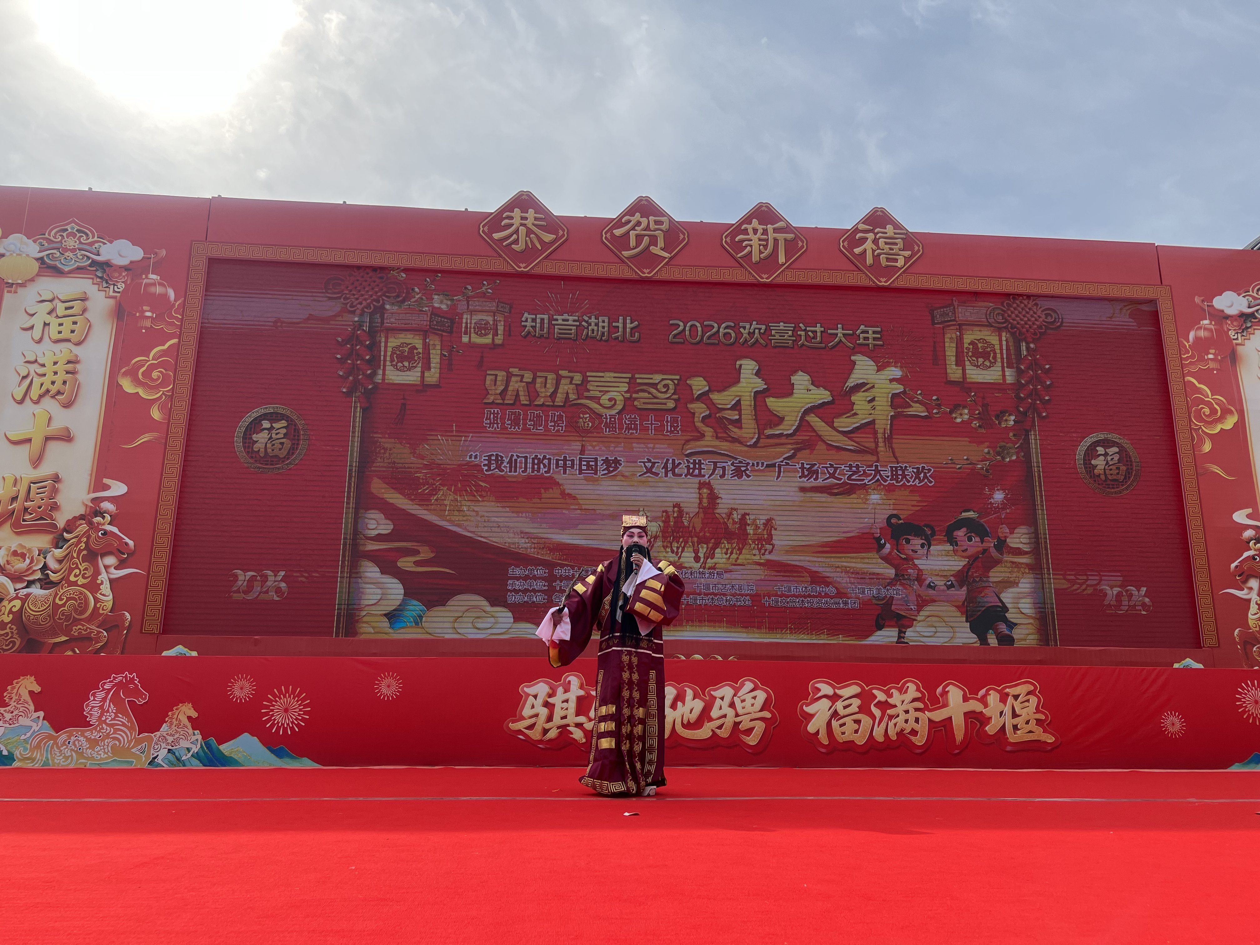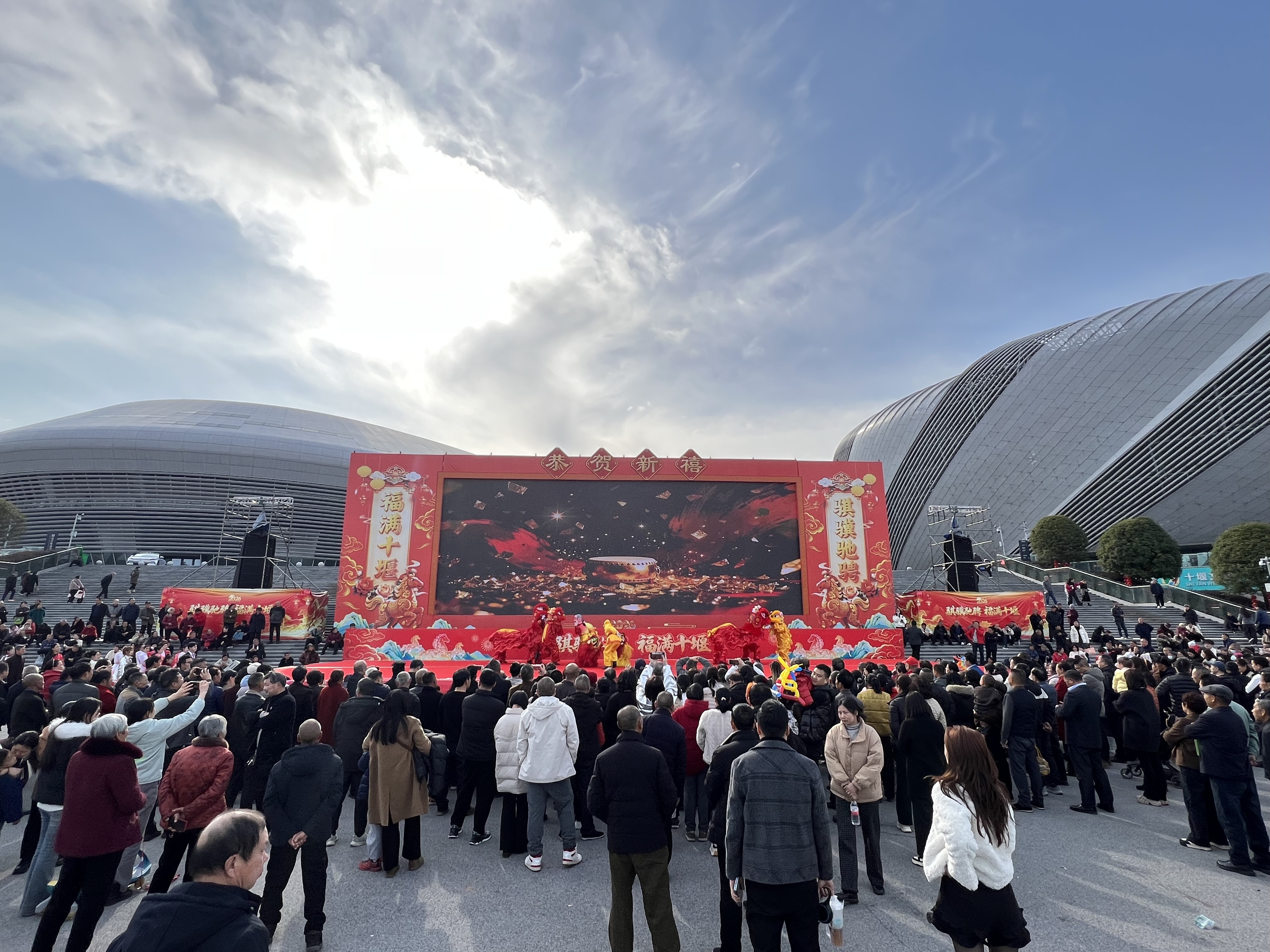 骐骥驰骋迎新岁,福满十堰贺新春。为深入学习贯彻党的二十届四中全会精神,传承弘扬中华优秀传统文化,聚力服务支点建设,积极营造喜庆祥和的春节文化氛围,2月18日(大年初二)下午,由中共十堰市委宣传部、十堰市文化和旅游局主办,十堰市群众艺术馆(艺术研究院)、十堰市艺术剧院、十堰市体育中心、十堰市美术馆等单位承办的2026“知音湖北·欢喜过大年”十堰市“欢欢喜喜过大年”系列文化惠民演出大年初二专场活动在十堰市奥体中心东广场持续上演。