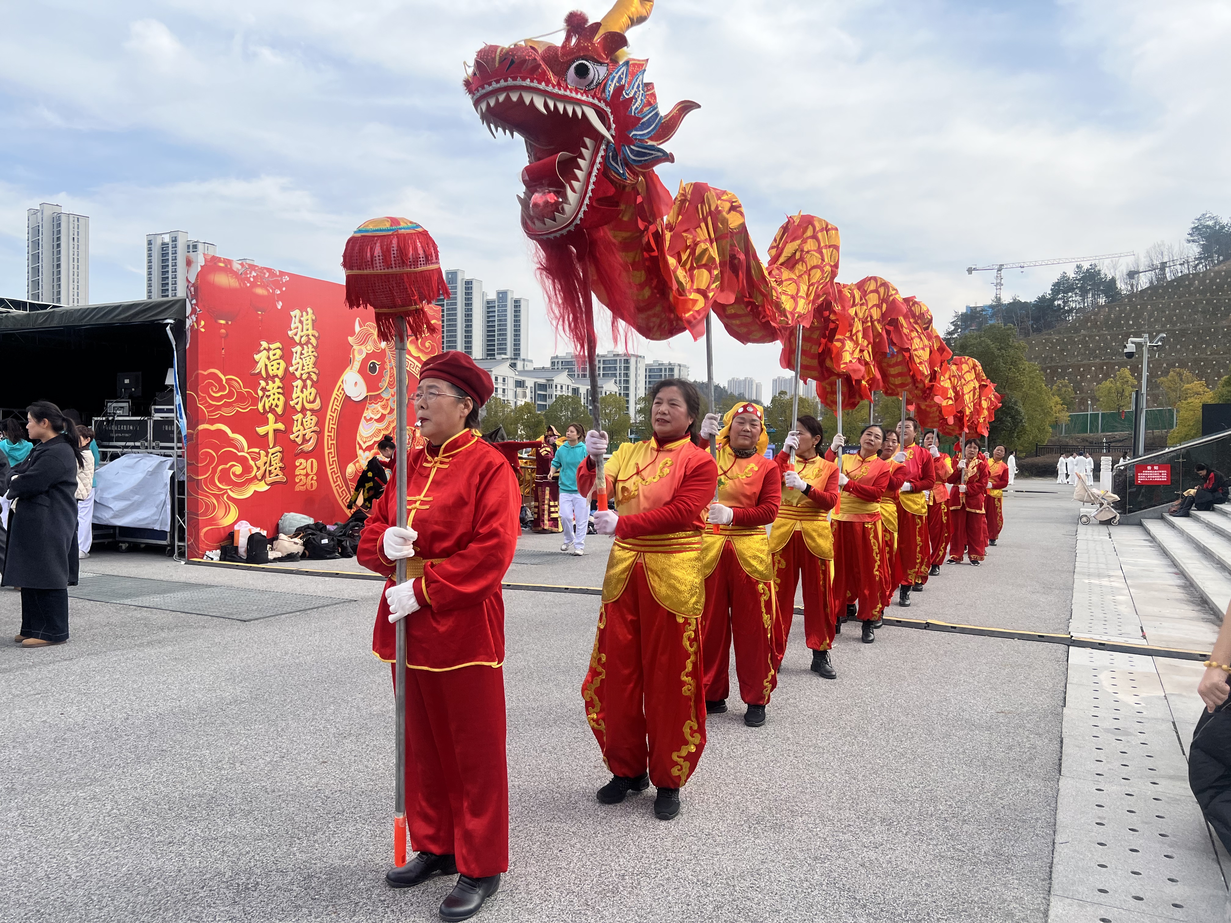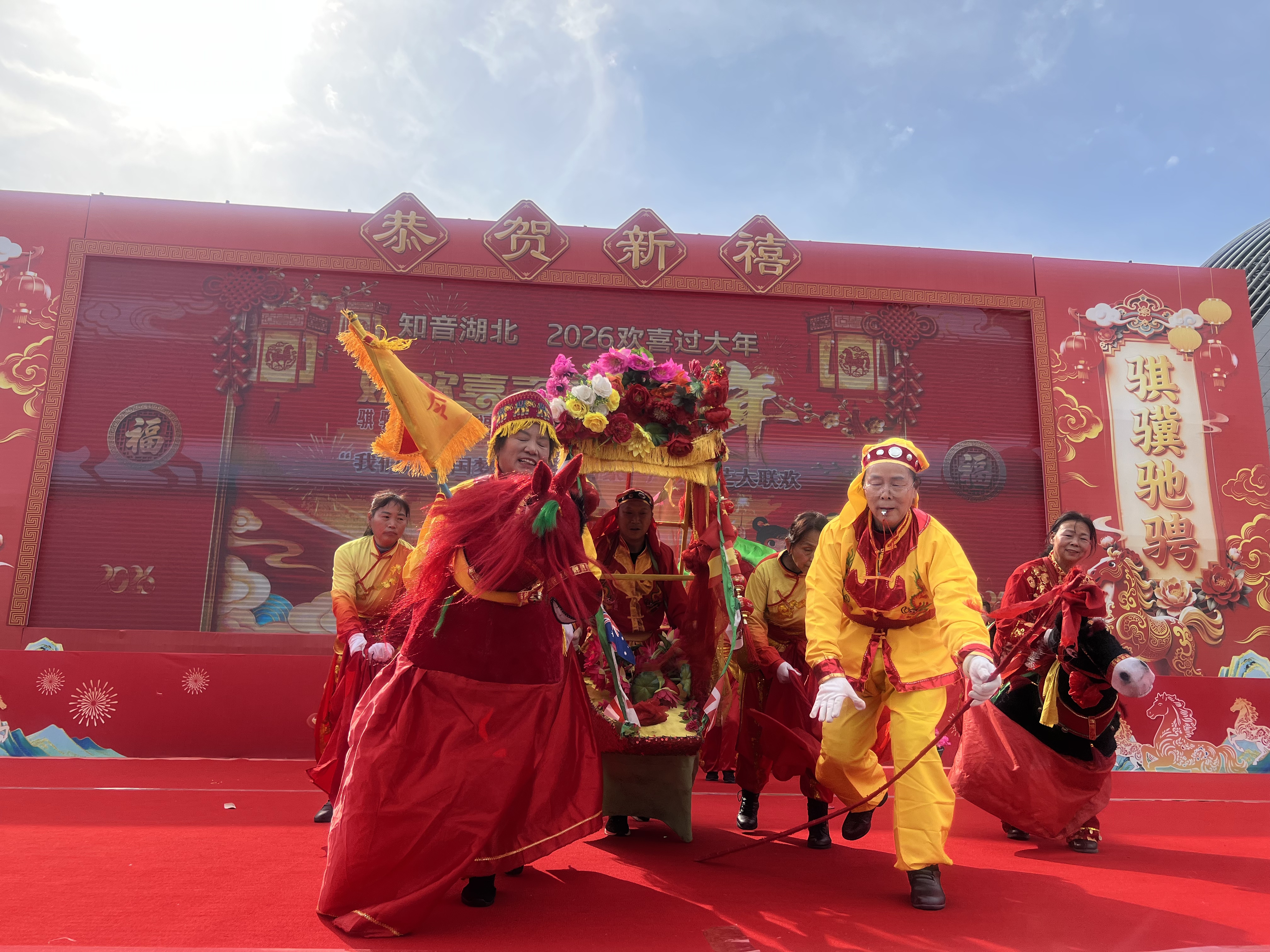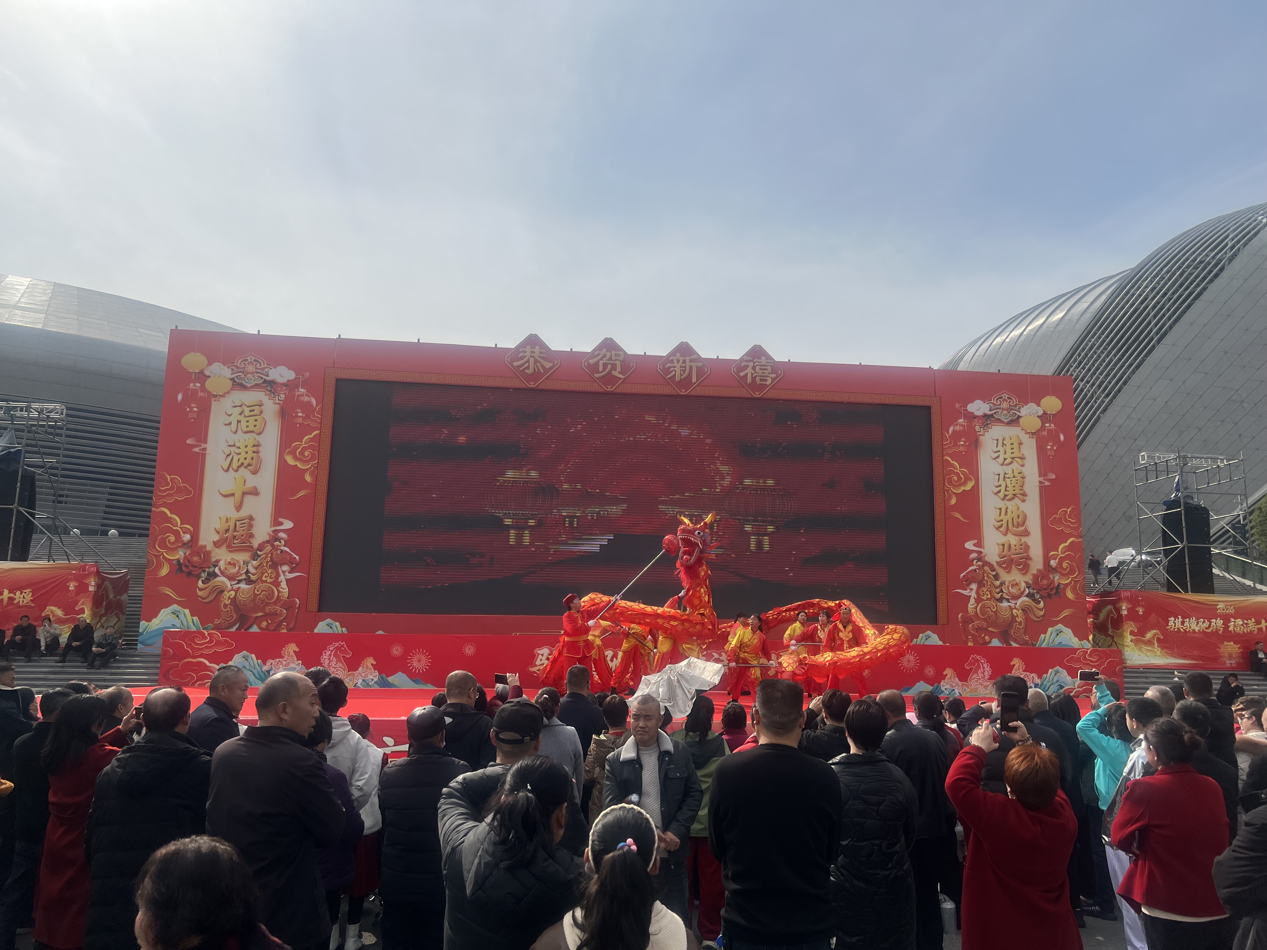 骐骥驰骋迎新岁,福满十堰贺新春。为深入学习贯彻党的二十届四中全会精神,传承弘扬中华优秀传统文化,聚力服务支点建设,积极营造喜庆祥和的春节文化氛围,2月18日(大年初二)下午,由中共十堰市委宣传部、十堰市文化和旅游局主办,十堰市群众艺术馆(艺术研究院)、十堰市艺术剧院、十堰市体育中心、十堰市美术馆等单位承办的2026“知音湖北·欢喜过大年”十堰市“欢欢喜喜过大年”系列文化惠民演出大年初二专场活动在十堰市奥体中心东广场持续上演。