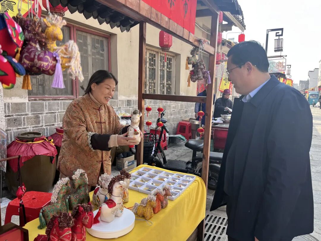春节期间,三义街张灯结彩、人流如织。走进三义街,青石板路两侧挂满了红灯笼,年货摊位前人头攒动。尤为引人注目的是街角的非遗摊位——刺绣传承人飞针走线,绣出骏马奔腾的吉祥意象;糖画摊前更是围满翘首以盼的市民,传承人以勺为笔、以糖为墨,手腕轻抖间,一匹匹栩栩如生的“糖马”便跃然板上。今年恰逢马年,传承人们特意创作的马元素主题作品,引得市民争相购买,为古街增添了浓浓的“马年味”。