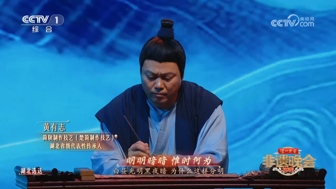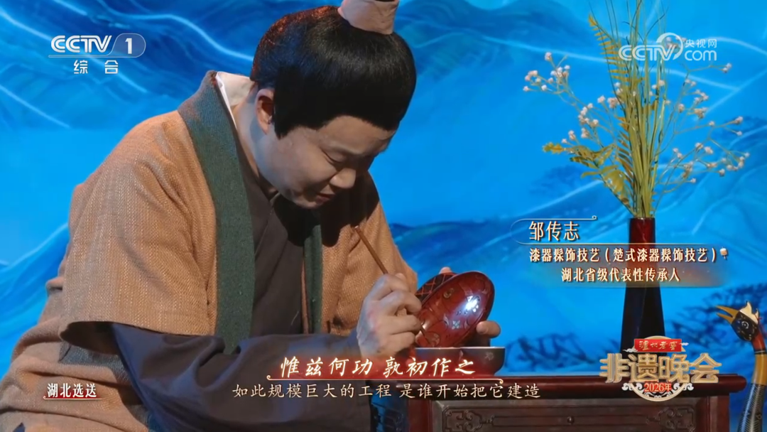 央视《2026年非遗晚会》舞台上迎来铿锵回响。演员丁勇岱倾情演绎的《天问・大地颂歌》节目中,楚简、编钟、楚香、楚漆四项荆楚非遗联袂登场,以指尖匠心作答千年求索。