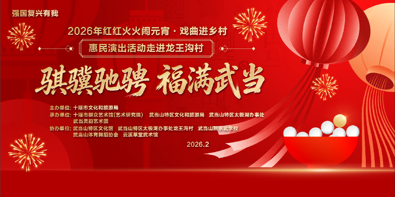 为深入学习贯彻党的二十届四中全会精神,积极营造喜庆祥和的元宵节日氛围,由十堰市文化和旅游局主办,十堰市群众艺术馆(艺术研究院)等单位承办的“骐骥驰骋 福满武当”“红红火火闹元宵 戏曲进乡村”文化惠民演出将于2月27日下午在武当山特区龙王沟村举办,欢迎广大市民朋友前往免费观看。