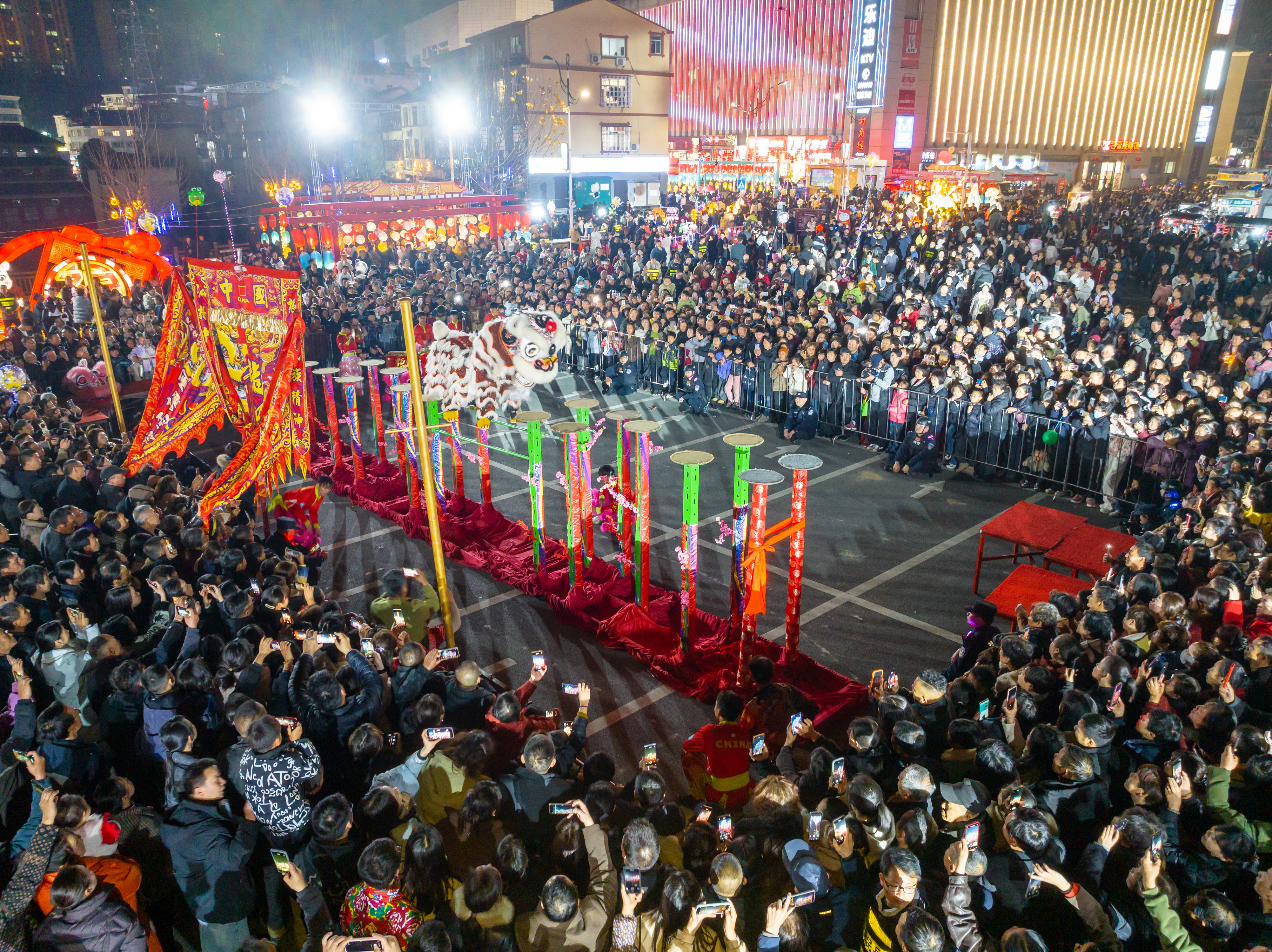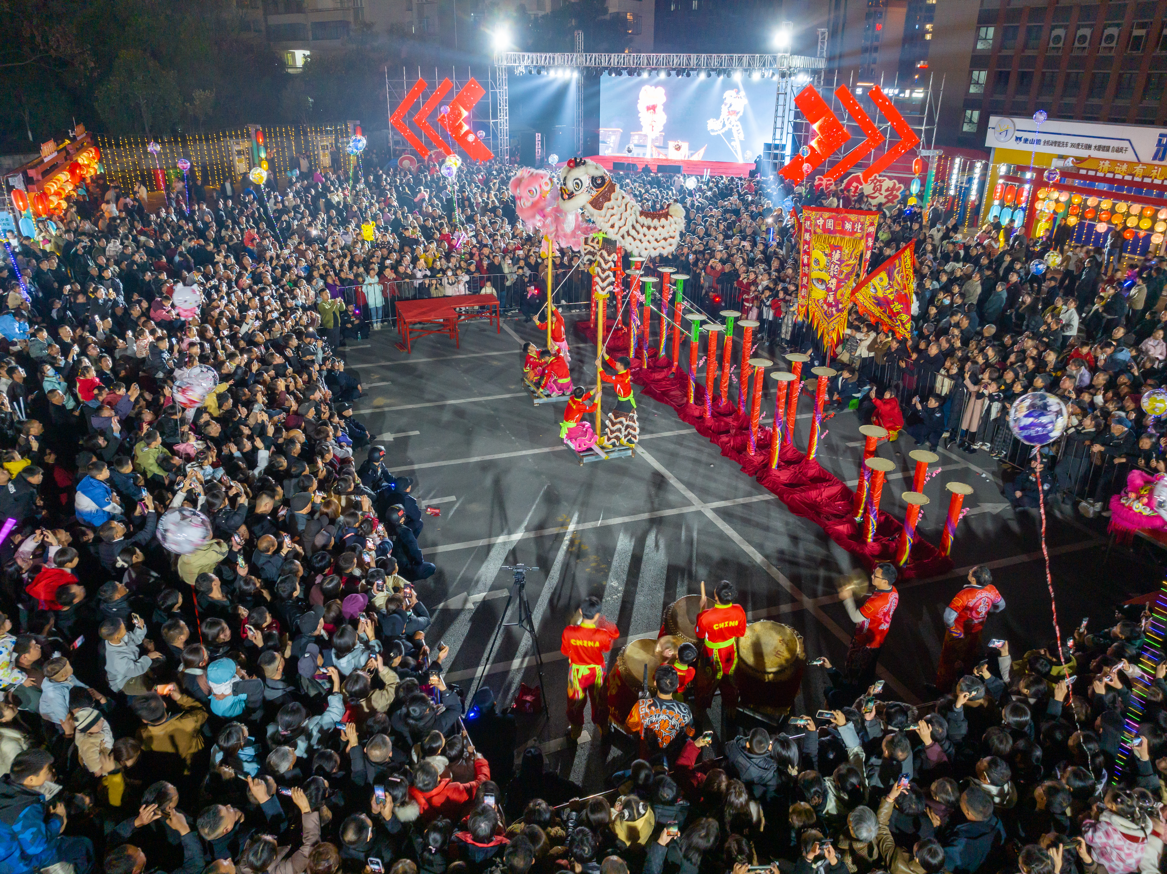 三天来,粤客隆广场化身欢乐的海洋:千条趣味灯谜前,老少争相竞猜,智慧碰撞间欢声四起;梅花桩舞狮惊险绝伦,赢得满堂喝彩;“音乐潮玩”“非遗舞蹈”“元宵团圆”三场主题演出轮番登场;花灯展区流光溢彩,特色美食与文创摊位前烟火升腾,备受青睐。