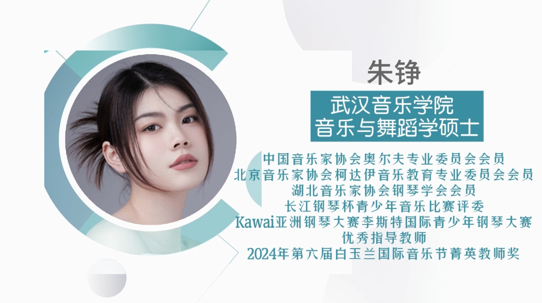 朱铮老师是武汉音乐学院音乐与舞蹈学硕士,是中国音乐家协会奥尔夫专业委员会、北京音乐家协会柯达伊音乐教育专业委员会、湖北音乐家协会钢琴学会会员,也是长江钢琴杯青少年音乐比赛、Kawai亚洲钢琴大赛、李斯特国际青少年钢琴大赛等权威赛事的专业评委。丰富的专业经历和教学经验,让朱老师能够精准把握学员的学习需求,用通俗易懂的方式传授专业知识。