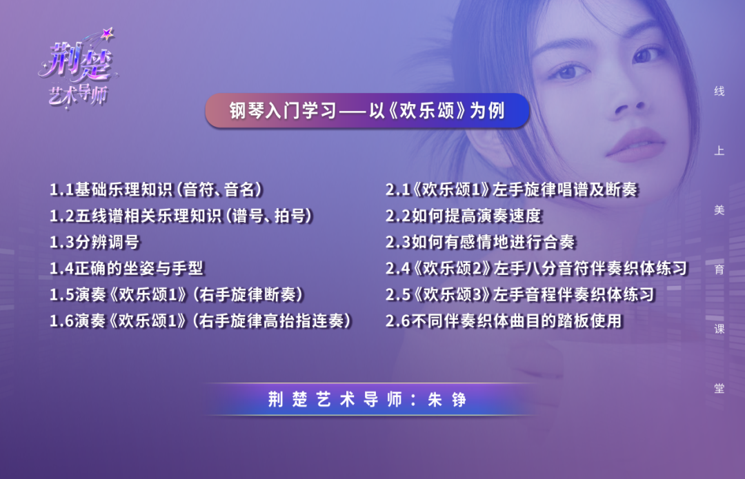 本期“荆楚艺术导师”线上美育课堂邀请钢琴老师朱铮,为零基础艺术爱好者量身定制钢琴启蒙课,从经典乐曲《欢乐颂》起步,轻松开启钢琴艺术之旅。