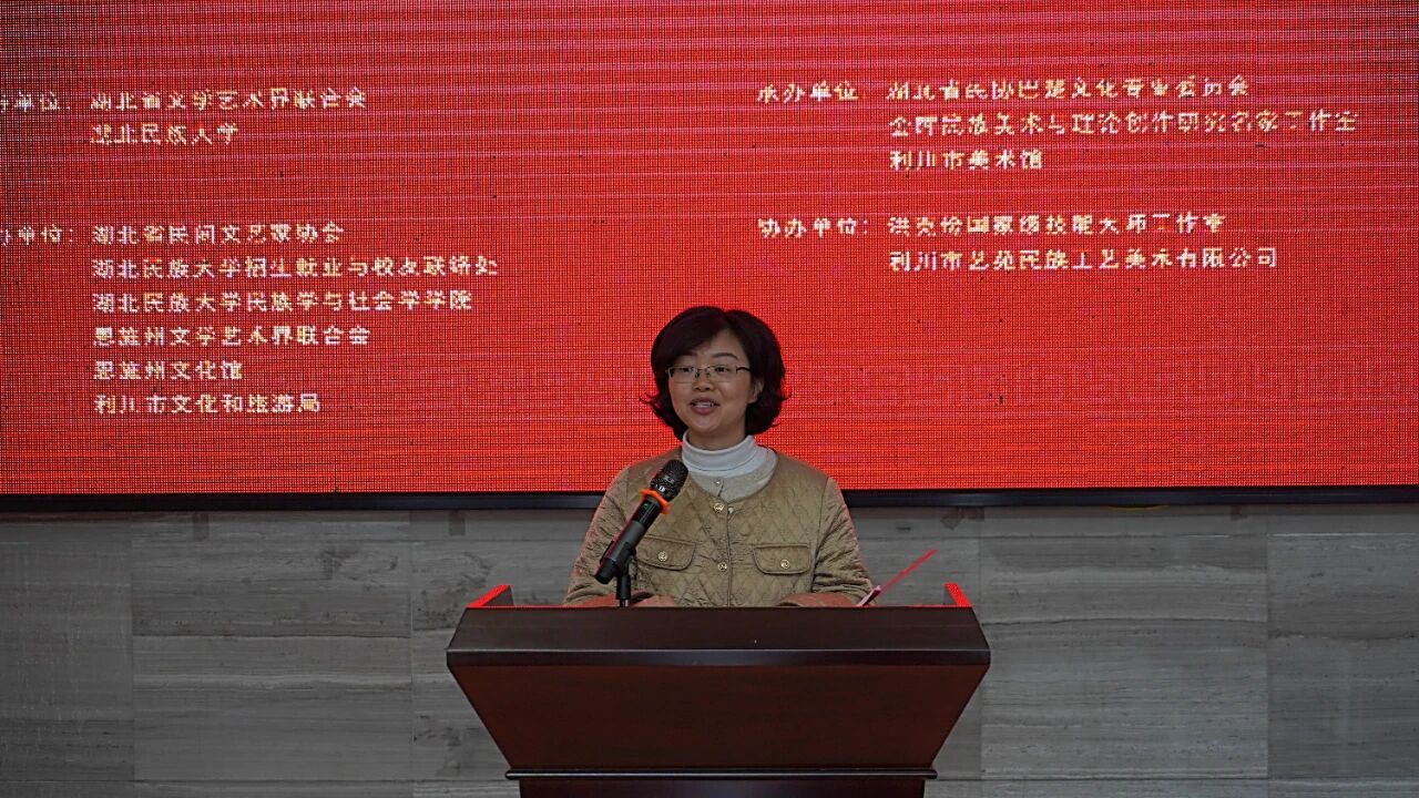 湖北省文学艺术界联合会、湖北省民间文艺家协会、湖北民族大学、 恩施州文学艺术界联合会、恩施州文化馆和利川市文化和旅游局等相关单位领导与嘉宾共同出席了开幕式。湖北省民间文艺家协会主席鄢维新、中共利川市委常委、宣传部部长、统战部部长刘玲芳同志、湖北民族大学党委常委、宣传部部长、副校长、教授李军同志先后为活动致辞。省文联党组成员、副主席马尚云为展览启幕。