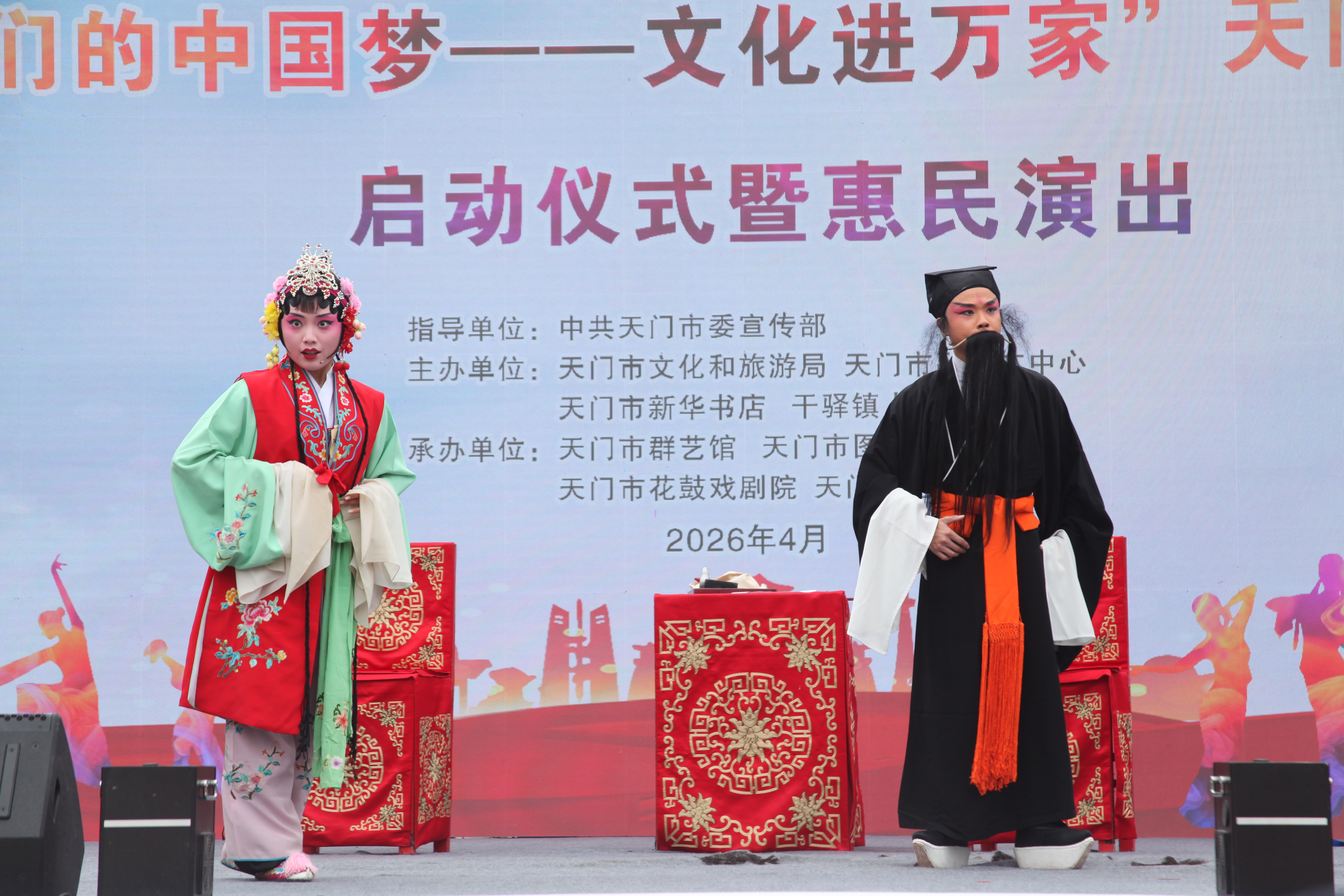 4月3日上午,由中共天门市委宣传部指导,天门市文化和旅游局、天门市融媒体中心、天门市新华书店、天门市干驿镇人民政府主办,天门市群众艺术馆、天门市图书馆、天门市花鼓戏剧院、天门市电影公司承办的2026年天门市“我们的中国梦——文化进万家”暨文化下乡活动启动仪式在干驿镇全民健身中心文化广场盛大开幕。